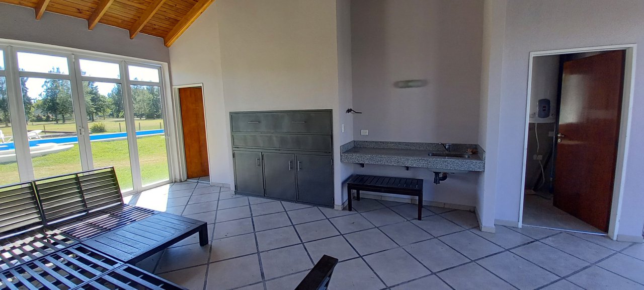 QUINCHO DE 32 MTS. CON PARRILLA EMBUTIDA CON PUERTA CON AMORTIGUADORES, MESADA DE MÁRMOL CON PILETA Y MUEBLES CON PUERTAS PARA GUARDADO DE LEÑA. CON BAÑO COMPLETO.
