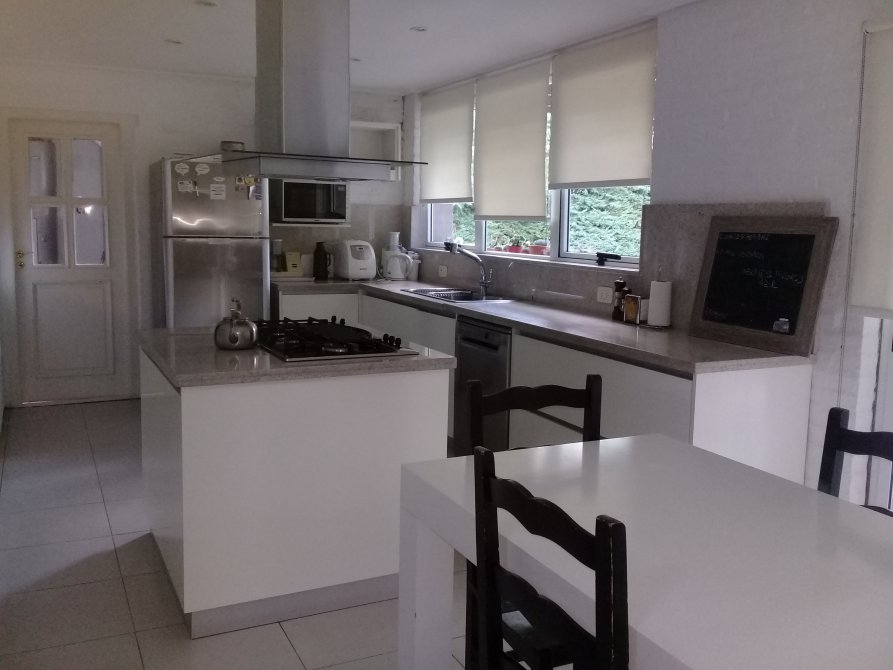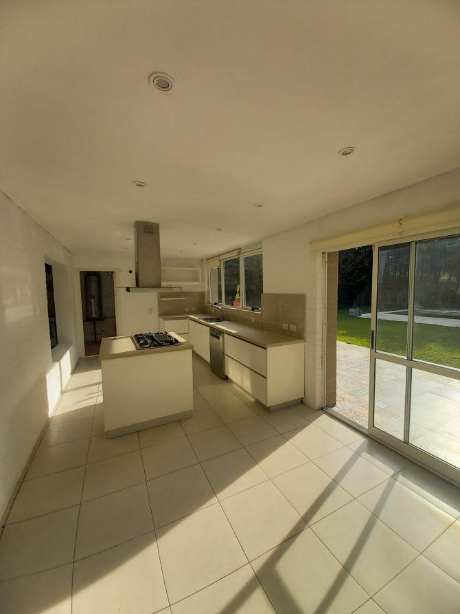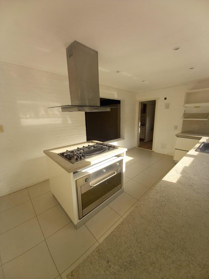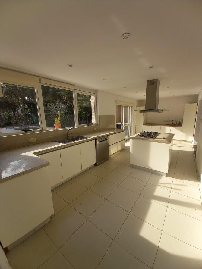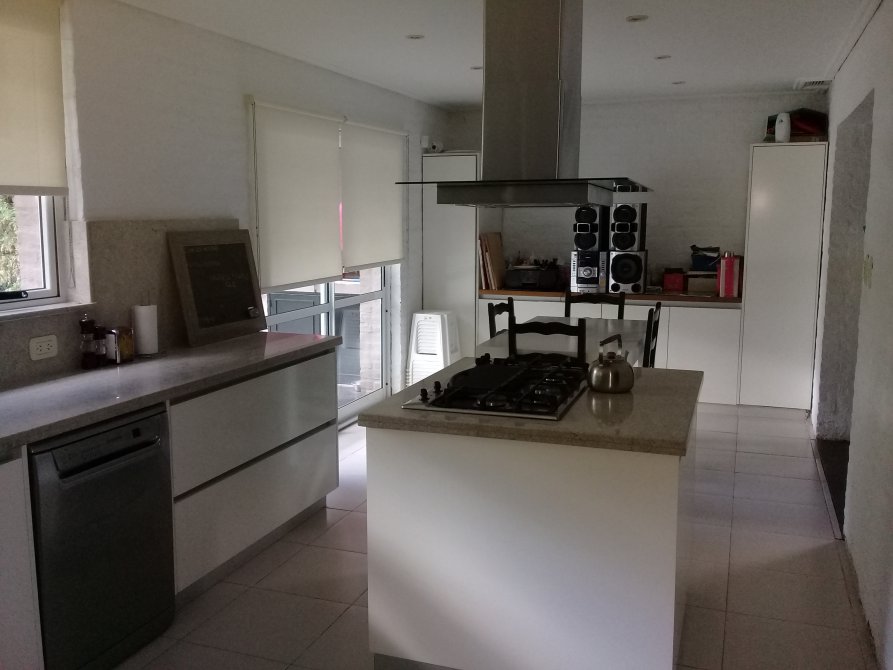 Amplia cocina – comedor con isla y muebles bajo mesada.