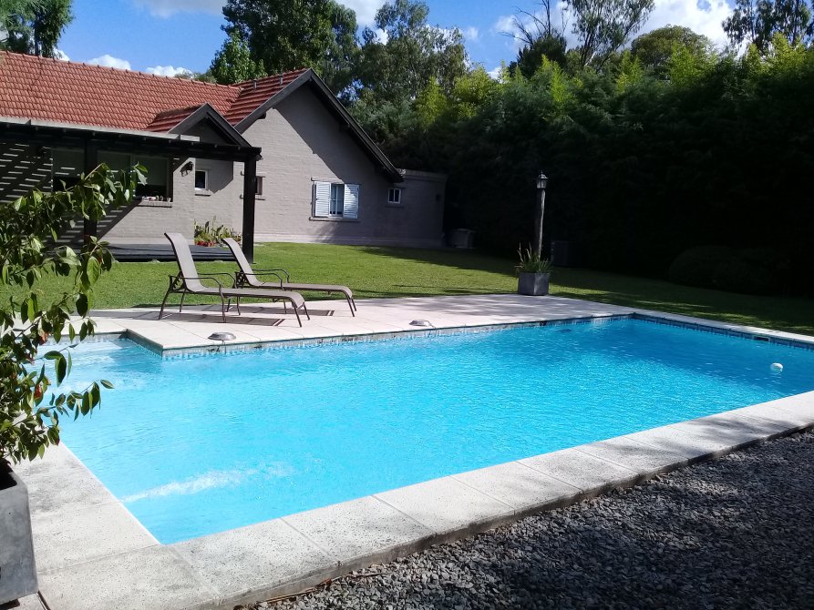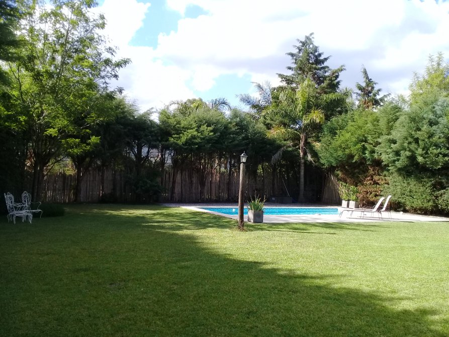 Parque libre con piscina de 8 x 4 x 2 metros, revestida en venecitas, con equipo de filtro y bomba.