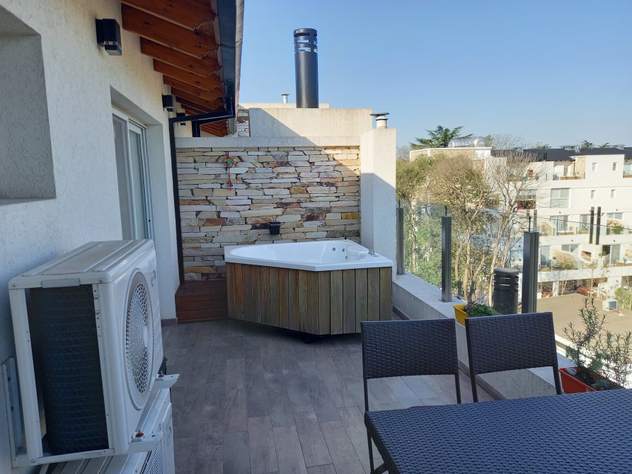 En la primera planta consta de living comedor con futon doble que se hace cama, toillette, en planta alta dormitorio con cama matrimonial , baño completo, balcon terraza con parrilla y jacuzzi.