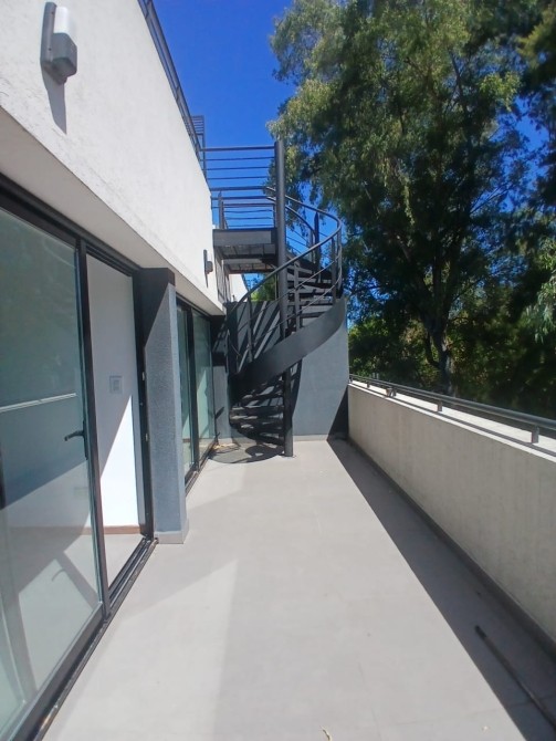 Balcon con escalera caracol que lleva a una gran terraza con parrilla propia.