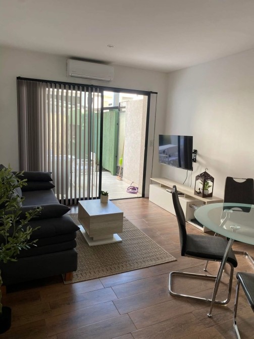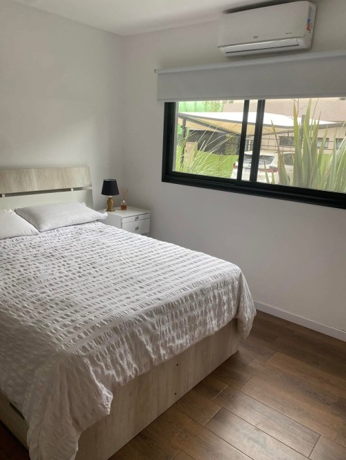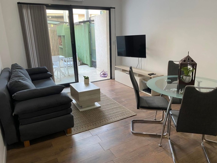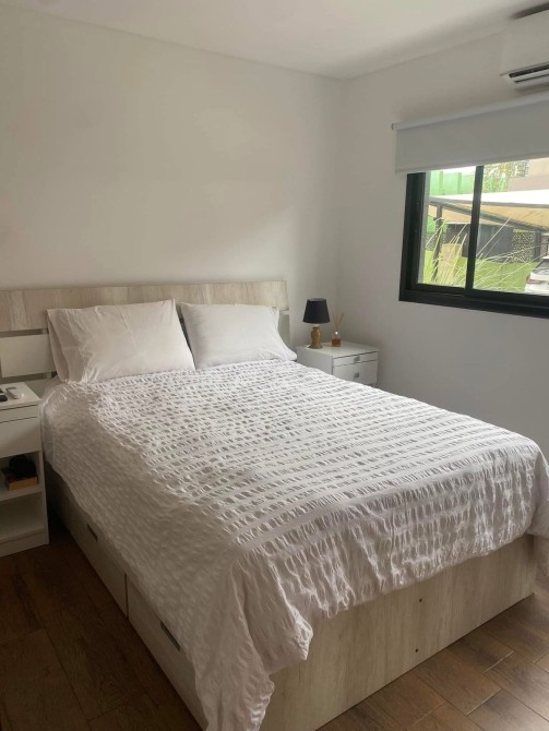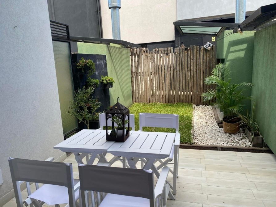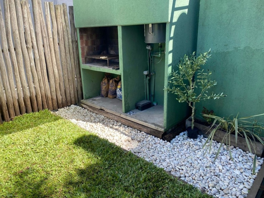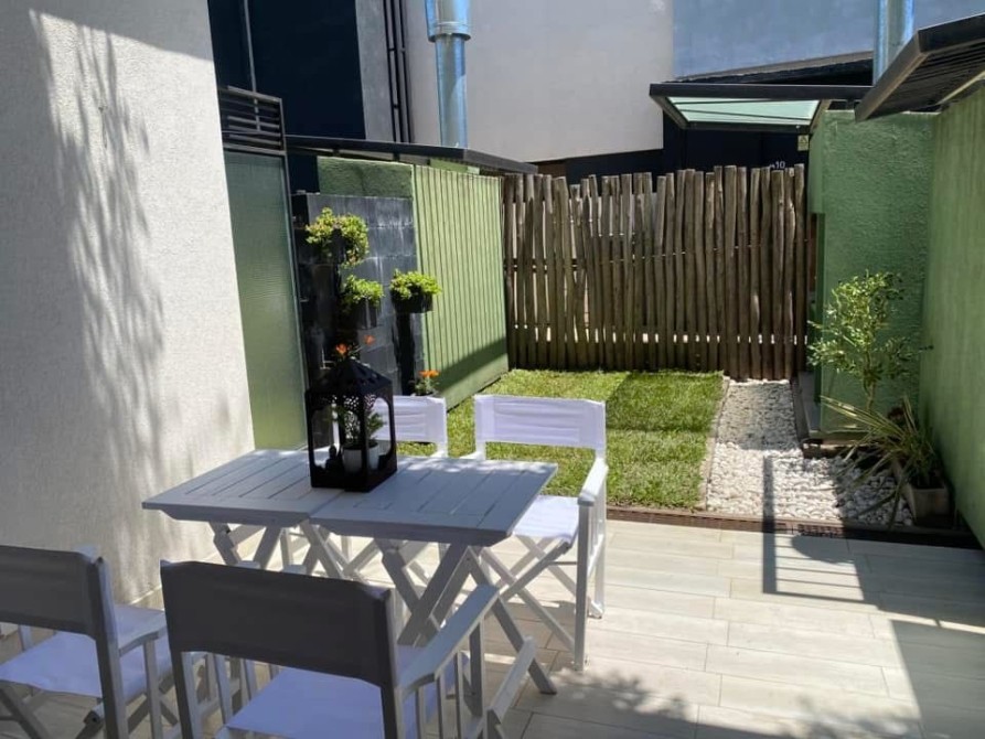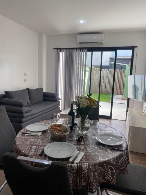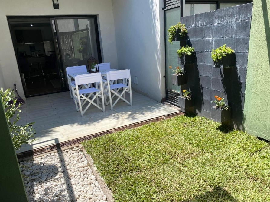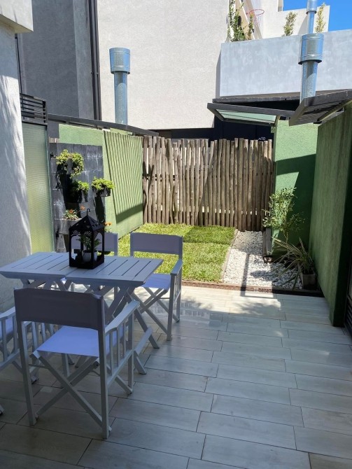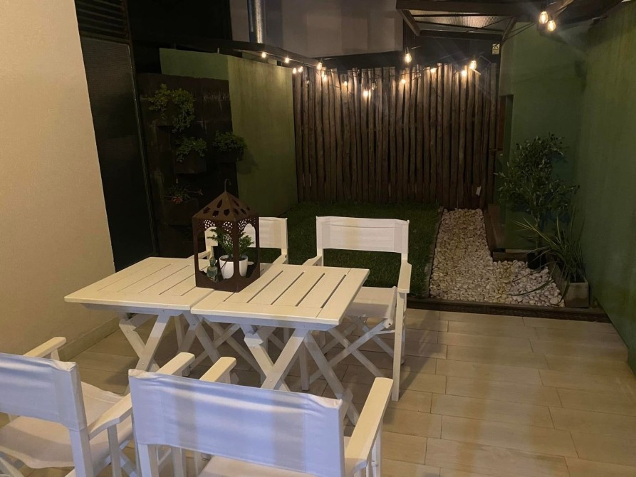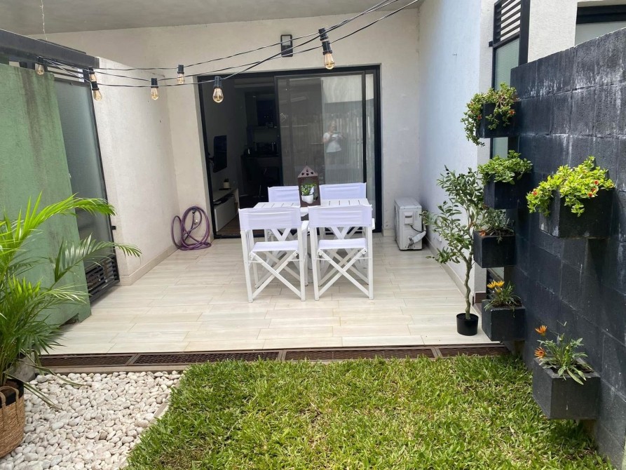 Patio privado con jardin y parrilla. El departamento cuenta con 2 aires acondicionados frio/ calor.