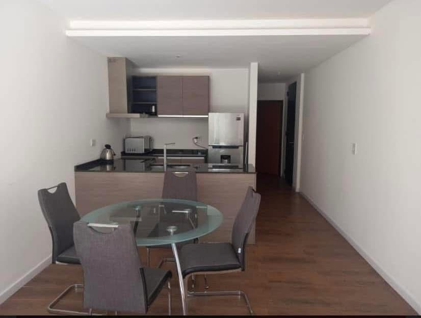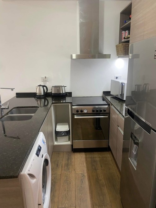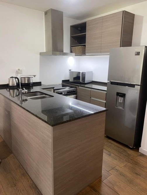 Consta de comoda cocina con barra, equipada con heladera con frezzer, microondas, lavarropas, etc.